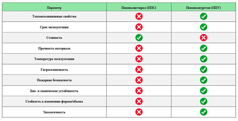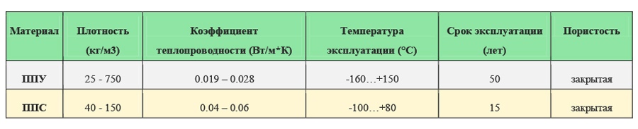 Результаты сравнения пенополиуретана и пенополистиролаДля удобства восприятия результаты сравнения мы вынесли в отдельную таблицу. |